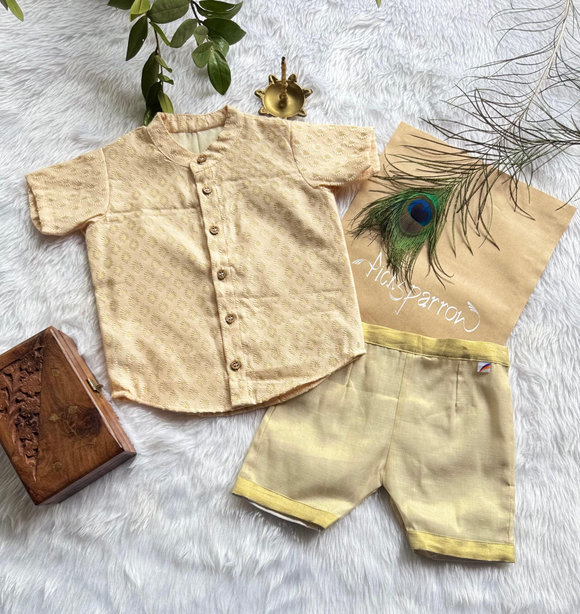 💚CHANDERI SHIRT – TISSUE SHORTS– Special occasion wear/Traditional wear/Ethnic wear for your little prince from Picksparrow. The elegant outfit is suitable for baby boys and can be used for any festive occasion like the naming ceremony, birthday celebration, Onam, Vishu, etc. The traditional outfit can be used for your little one’s naming ceremony (Newborn Baby Irupathettu, Choroonu attire) or for that traditional photo shoot you have planned.