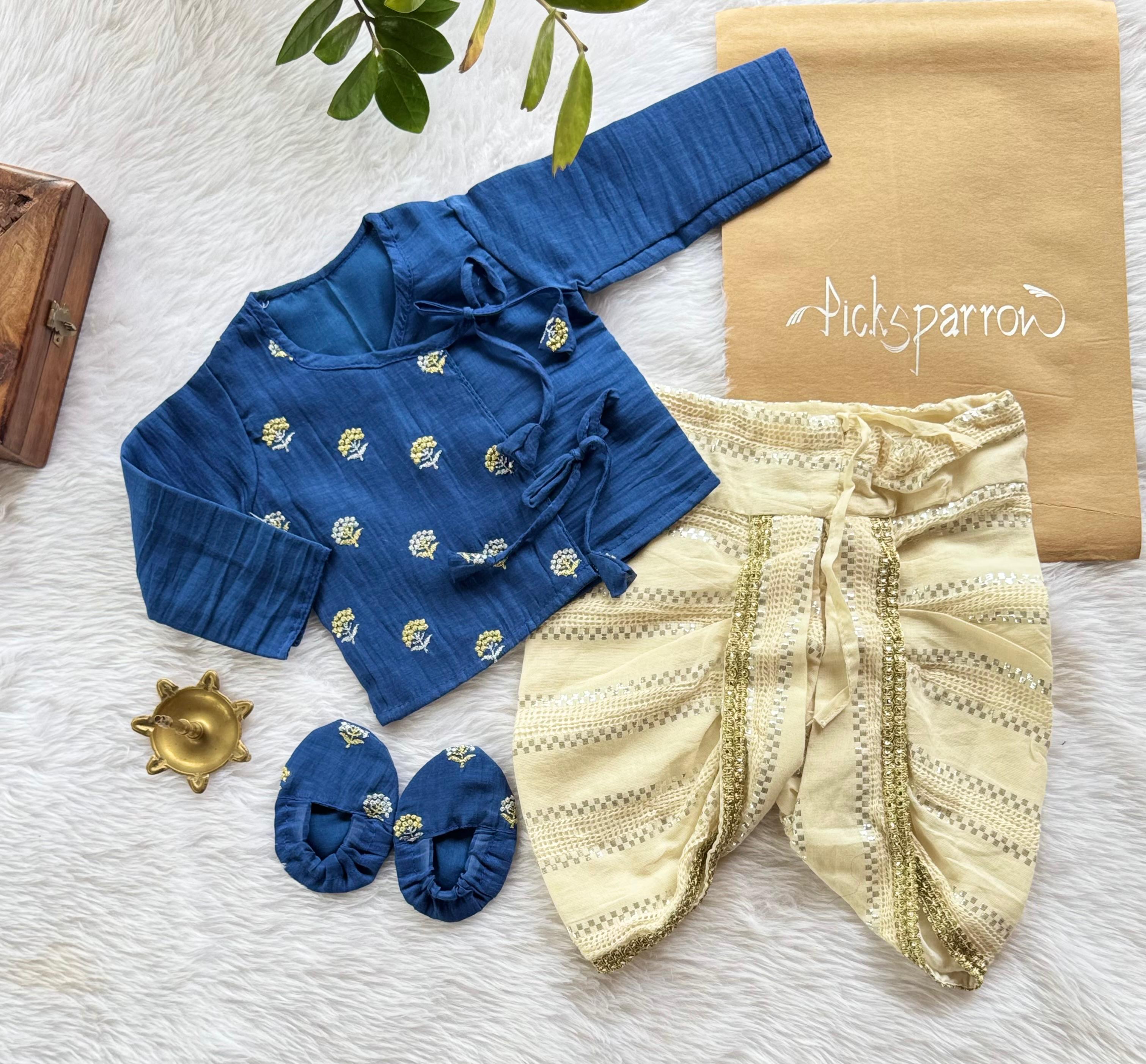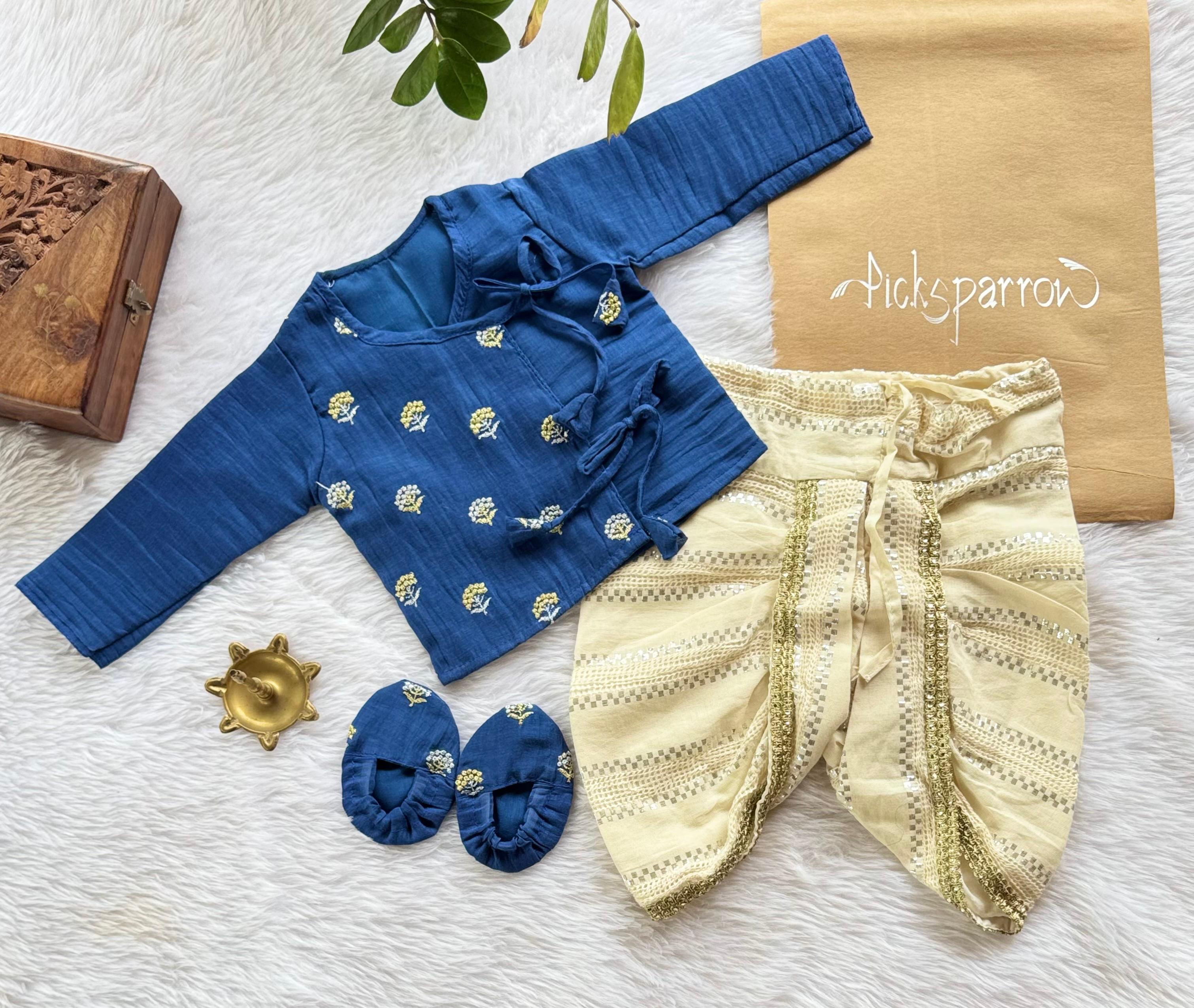 💚CRINKLED EMBROIDERED JHABLA – DHOTI PANT-BOOTIES– Special occasion wear/Traditional wear/Ethnic wear for your little prince from Picksparrow. The elegant outfit is suitable for baby boys and can be used for any festive occasion like the birthday celebration, Onam, Vishu, etc.