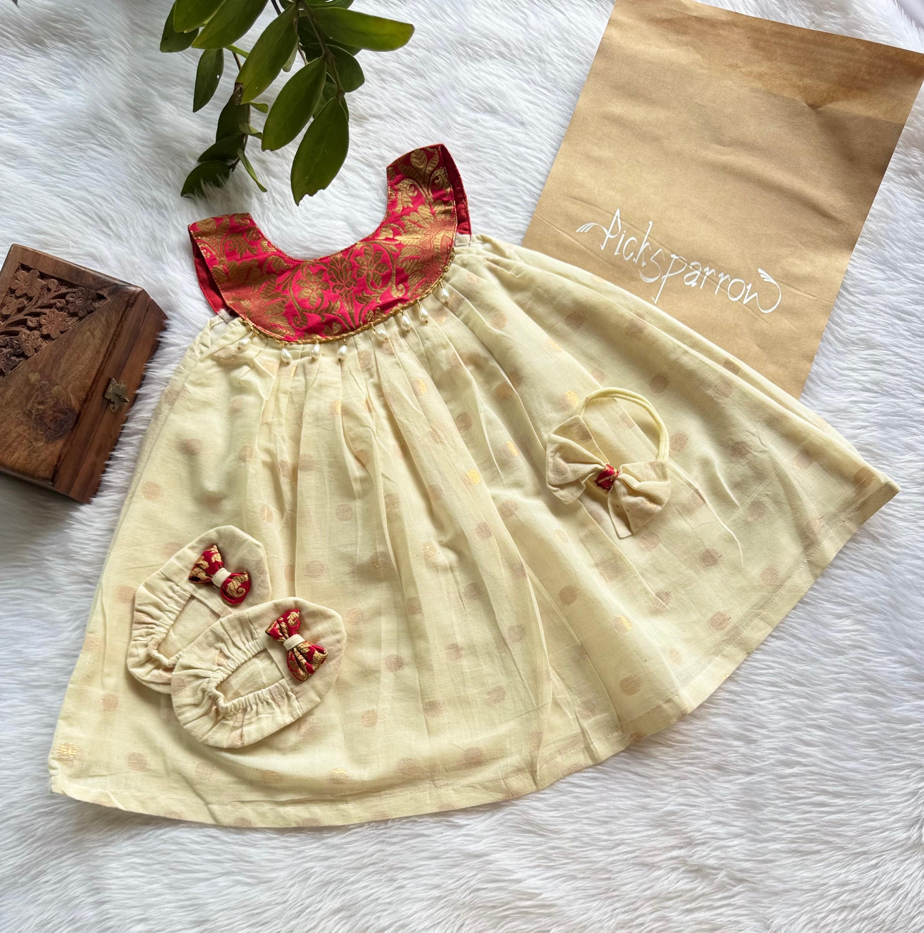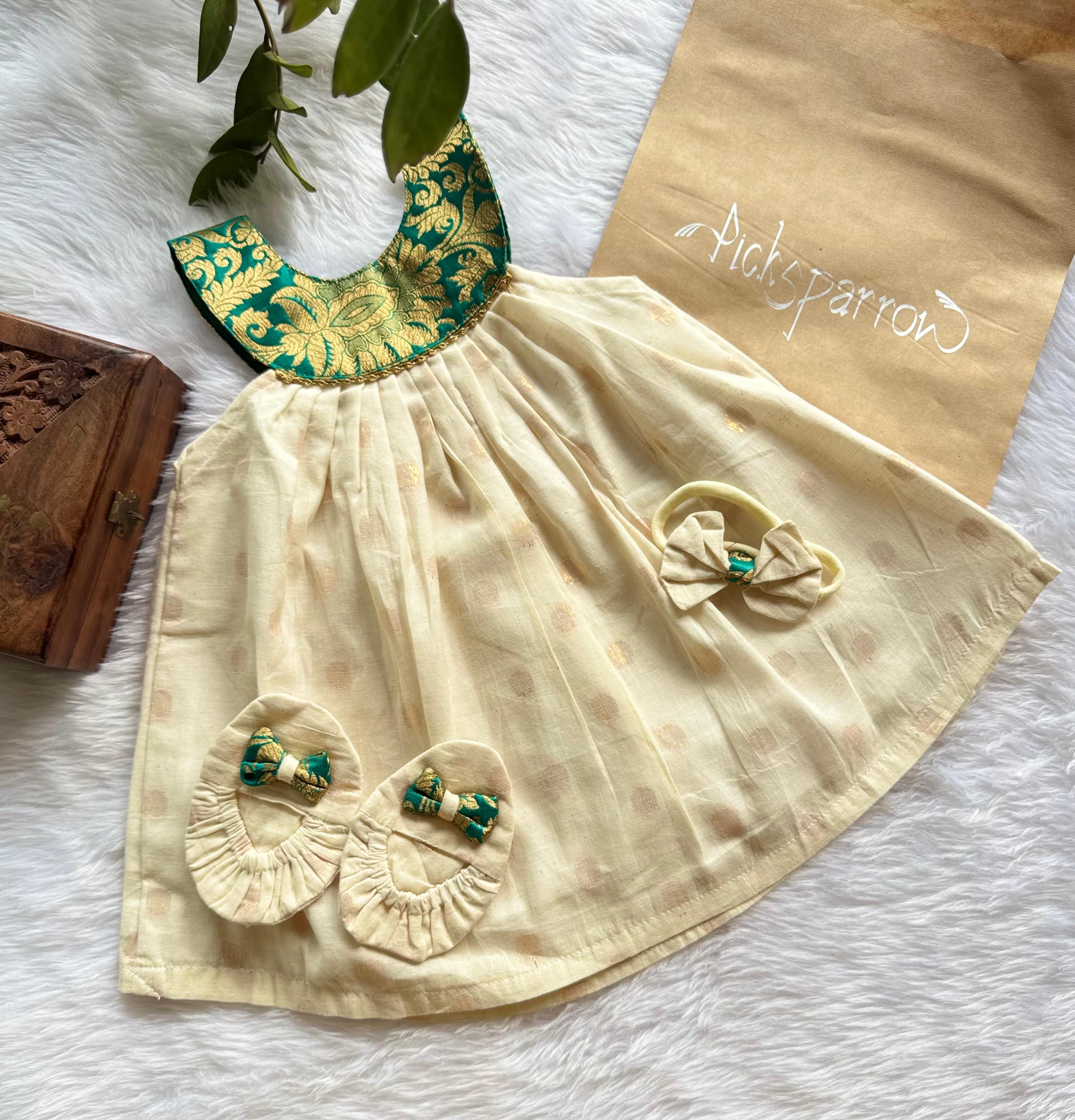 💚 COTTON LUREX FROCK –The elegant outfit is suitable for baby girls and can be used for any festive occasion like the naming ceremony, birthday celebration, Onam, Vishu, Pongal, Diwali etc.