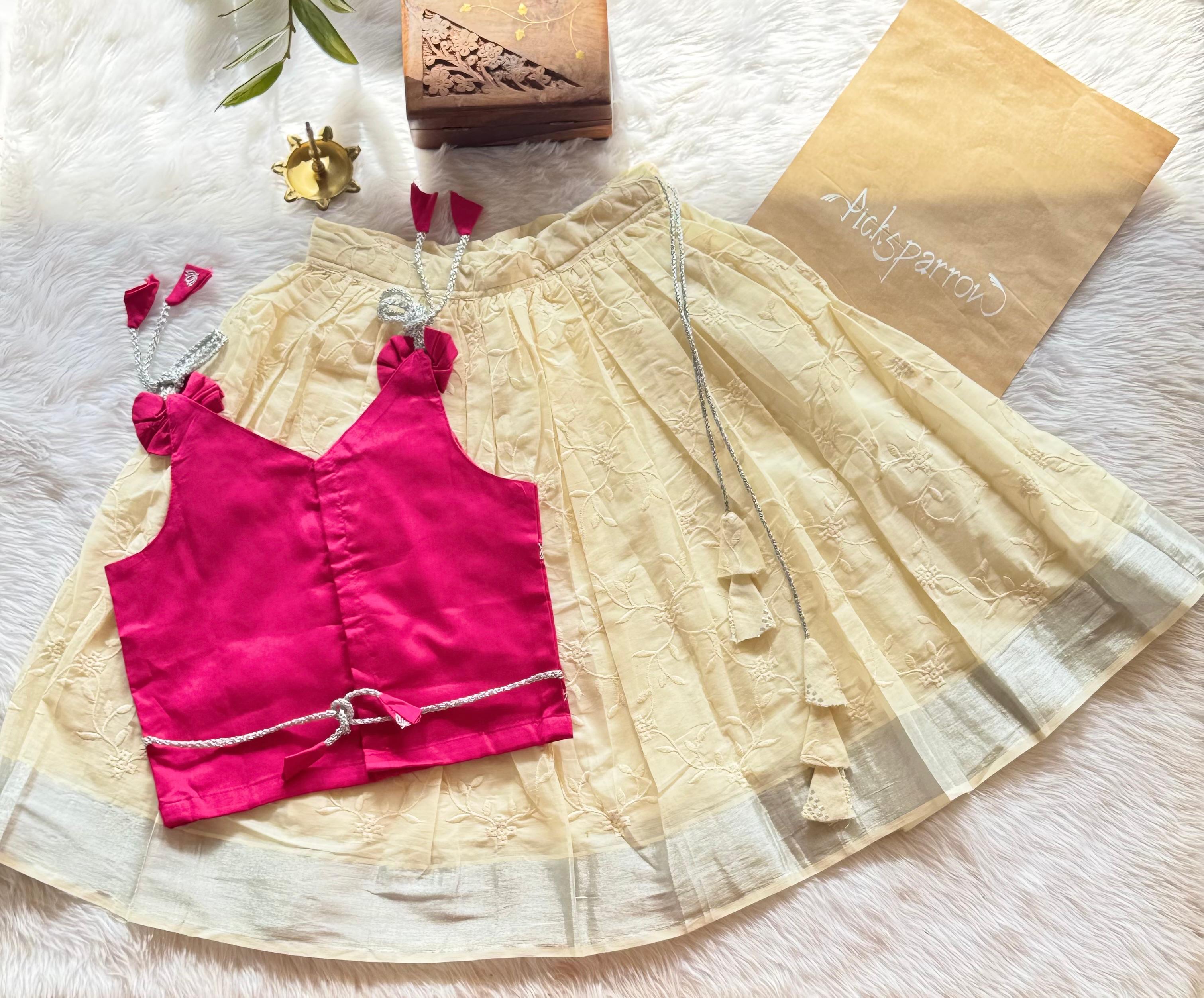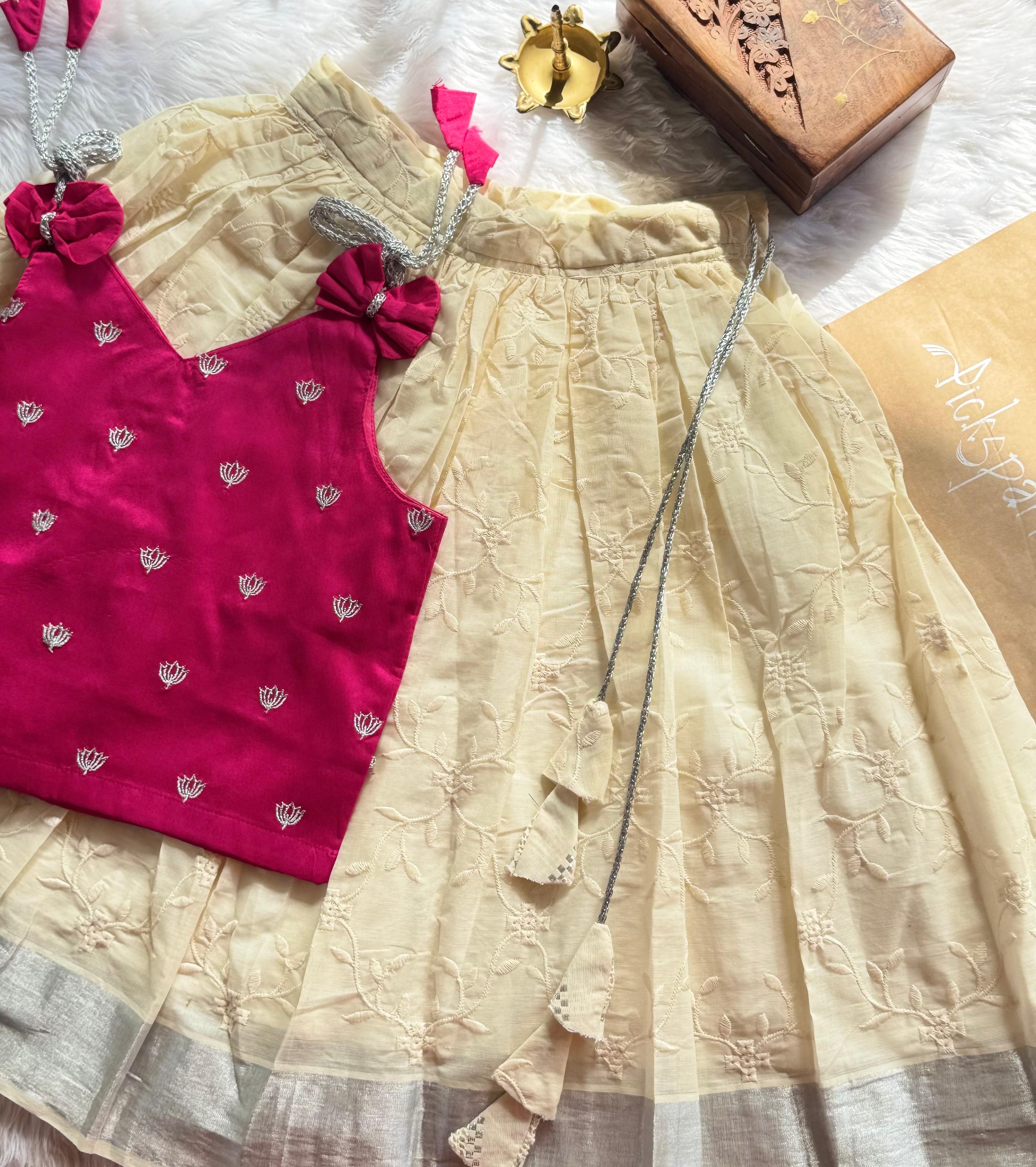 💚 COTTON SILK LOTUS BOW – EMBROIDERED SILVER PATTUPAVADA – Pattupavada/Traditional wear/Ethnic wear for your little princess from Picksparrow. The elegant outfit is suitable for baby girls and can be used for any festive occasion like the Diwali, birthday celebration, Onam, Vishu, Pongal etc.