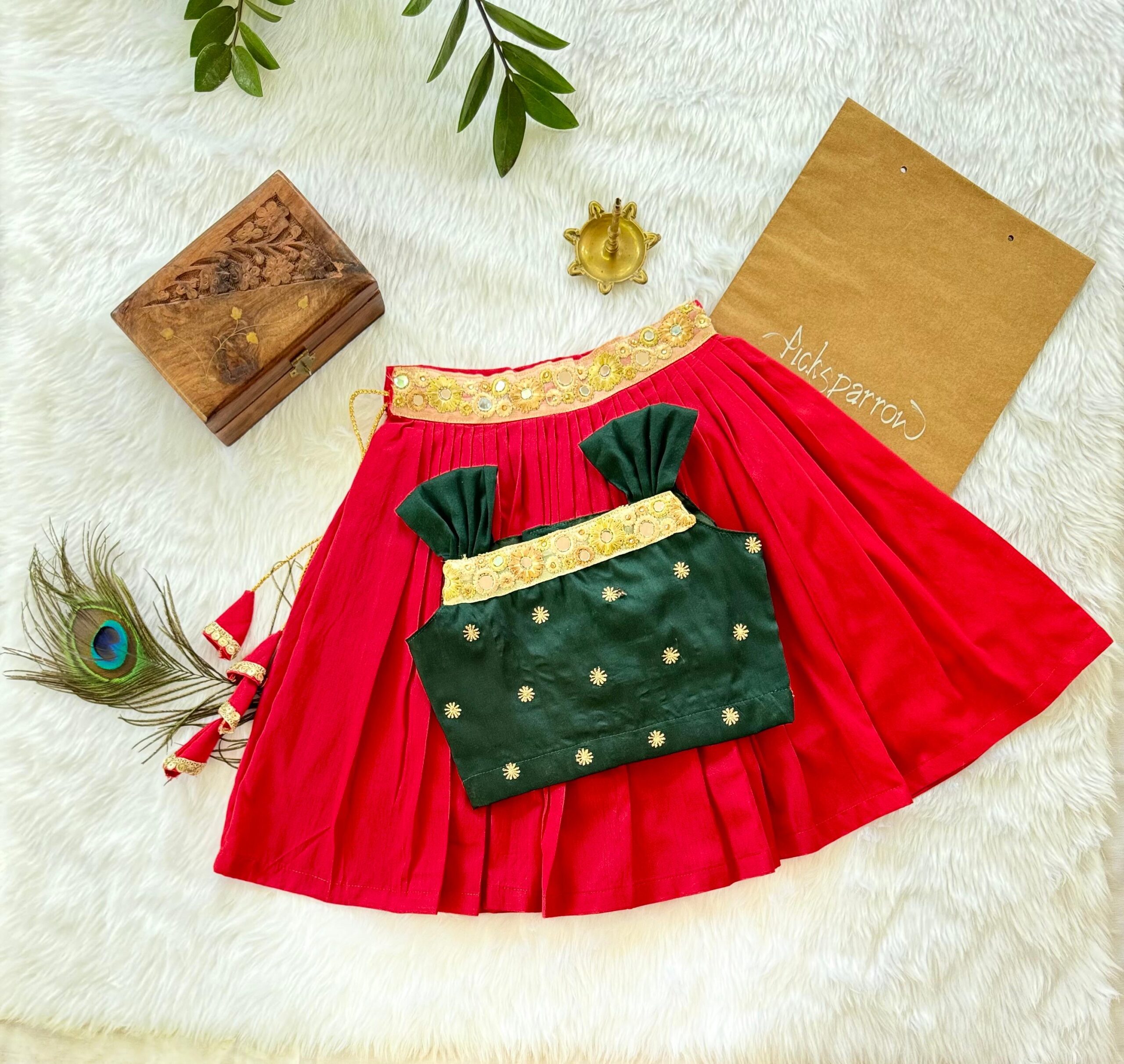 💚COTTON SILK – CROP TOP PATTUPAVADA – Pattupavada/Traditional wear/Ethnic wear for your little princess from Picksparrow. The elegant outfit is suitable for baby girls and can be used for any festive occasion like the naming ceremony, Diwali, birthday celebration, Onam, Vishu, Pongal etc.